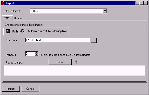 The program can follow links and automatically import linked Html pages. Click on the image to get Help: