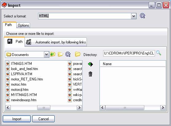 Import pages Automatic import Here you can search in the filesystem for files to import... This is the list of files currently selected for import Add the file in the import list Delete selected files from import list Click here to start the import