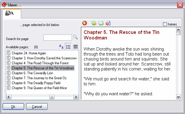 With “Hypertext >Go to page” you can choose the page to edit by name or through a browsing-enabled preview: