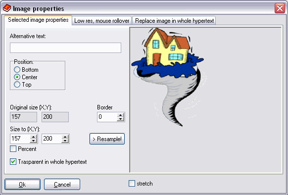 The image properties window; you can set a mouse-over image here (Image >Properties)