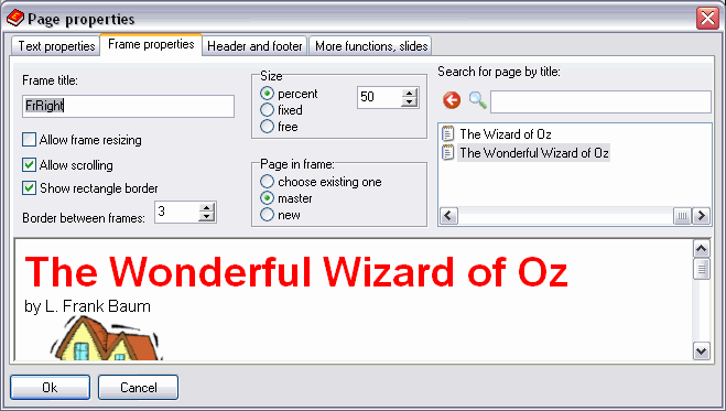 Edit page properties Frame properties Each frame can contain the master page, or any existing page, or a new Choose the page that will go inside the frame from the existing ones Preview of the page inside the frame Header and footer Additional functions, slides