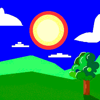 So, here is a very poor drawing of a sun shining on a tree in a hilly green landscape: