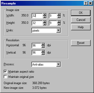 Now the second step is to reduce the size of the image, letting the paint program calculate how best to represent a 350 by 350 image in 32 by 32 pixels. In PSP (though other paint programs will have similar functions) you use the Resize / Resample function and the Image menu: